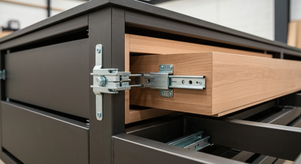 Rail and Pin/Latch LockExtremely secure and stable; ideal for heavy loads.Can be more complex to install; visible hardware may not suit all styles.Drawer modules, appliance lifts, or any heavy-duty application.
