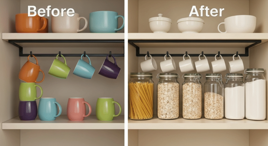We tackled the problem with two slide-on under-shelf racks, each with six hooks. We installed them side-by-side under that top shelf. Instantly, all 12 of his mugs had a new, secure home, hanging neatly in the previously empty airspace. The result? We freed up the entire top shelf. This space, once dedicated to a teetering tower of ceramic, was now perfectly organized with his canisters of flour, sugar, oats, and pasta. It was a simple, 15-minute fix that completely changed the functionality of his pantry.